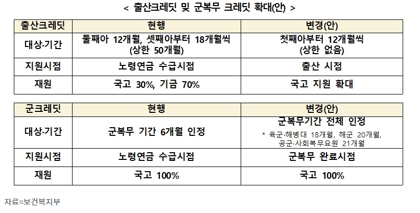 출산 및 군복무와 같이 사회적 가치가 있는 활동에 대한 보상을 강화하기 위한 크레딧 제도를 개선하며, 인정기간을 확대합니다.